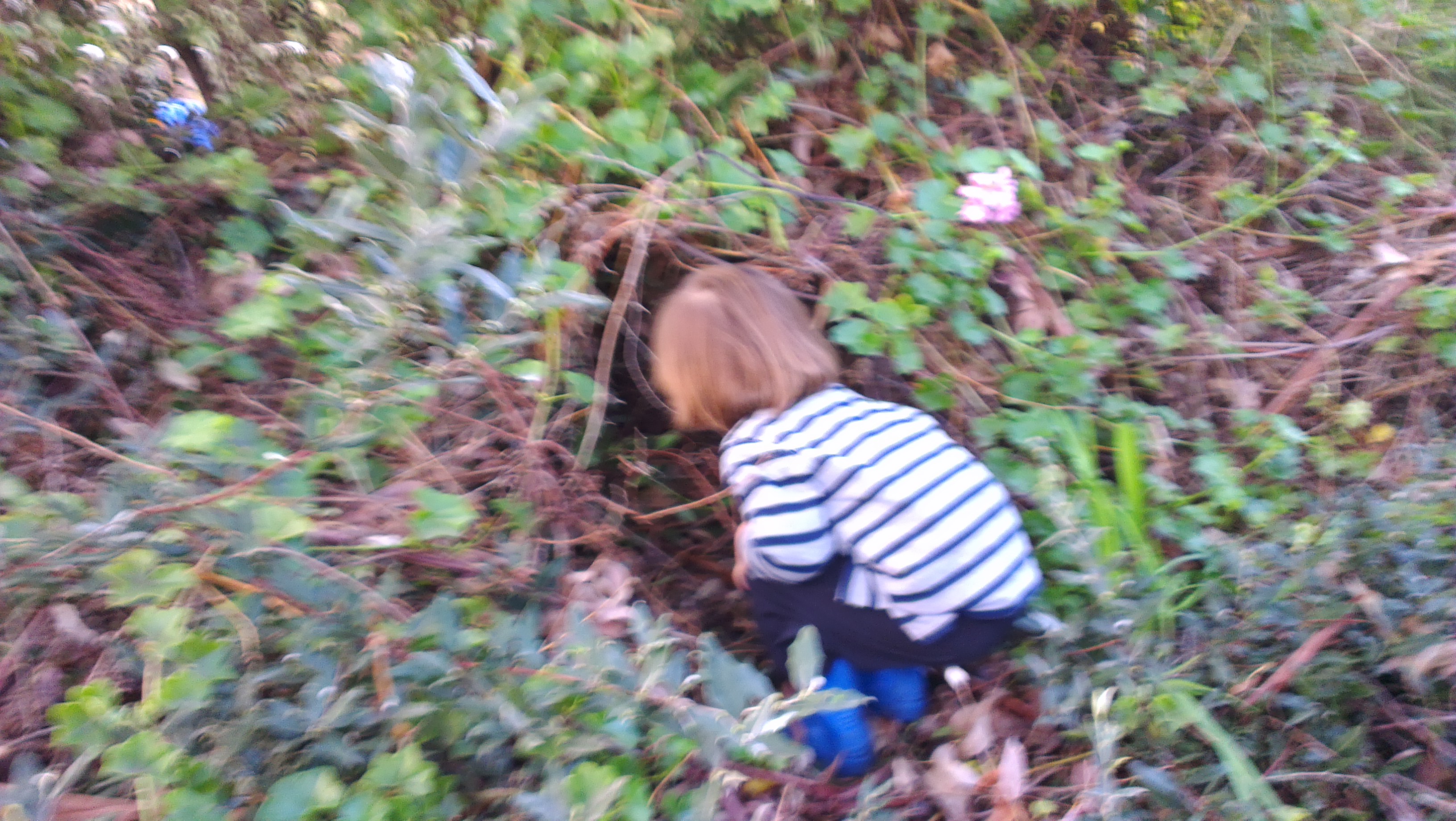 small boy peering into bushes