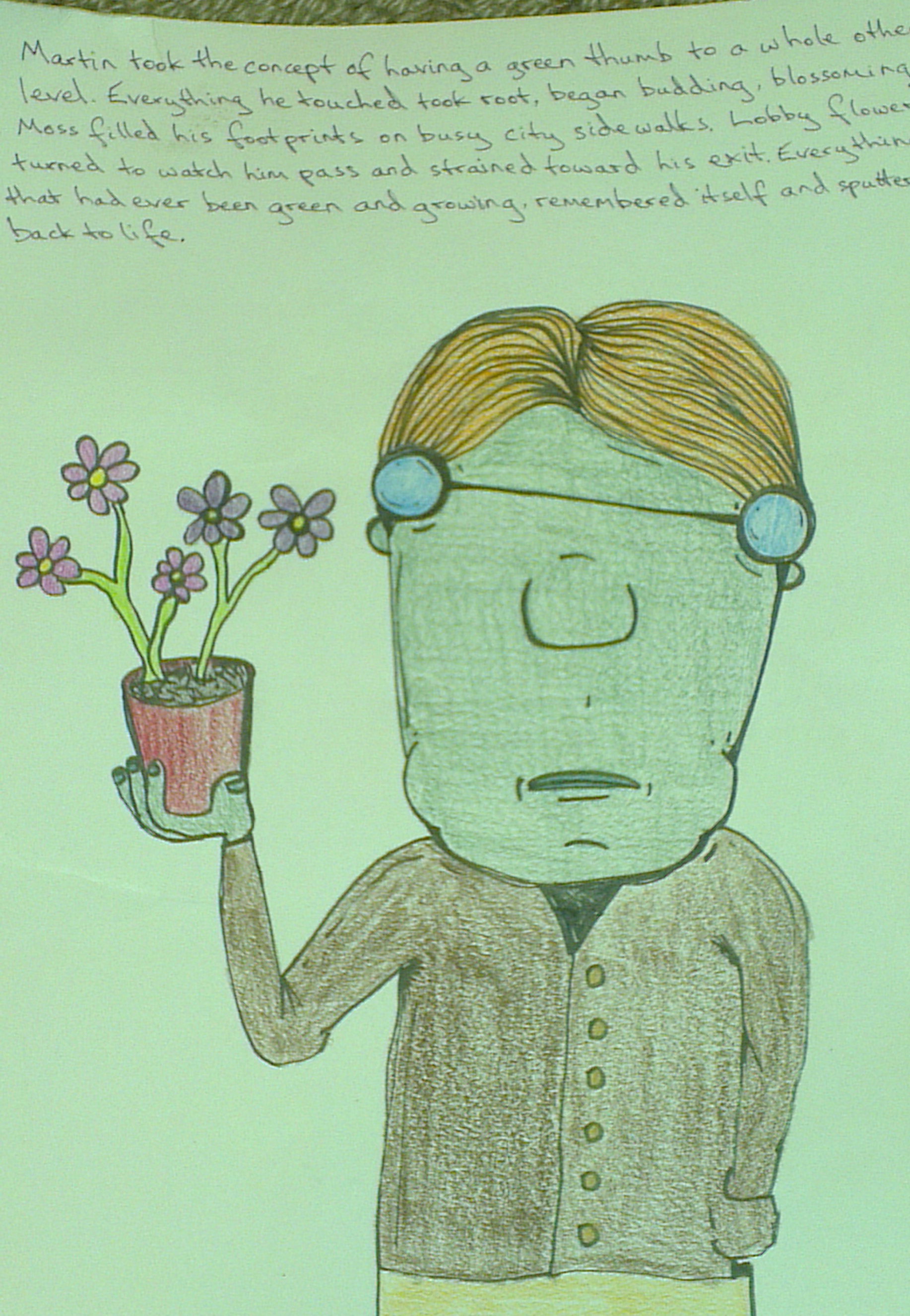 Last night a friend stood me up for dinner so I read some more of the book, and turned my attention to your drawing. It still didn’t speak to me but I figured the least I could do was colour it in. I like flowers so I started with them. He seemed like a nerdy guy so I went on and gave him a brown cardigan. Then it started to feel like a routine, I could see where it was heading. I wanted to mix it up and I didn’t have a pink pencil for his skin, so I made him green and that’s when the magic happened.